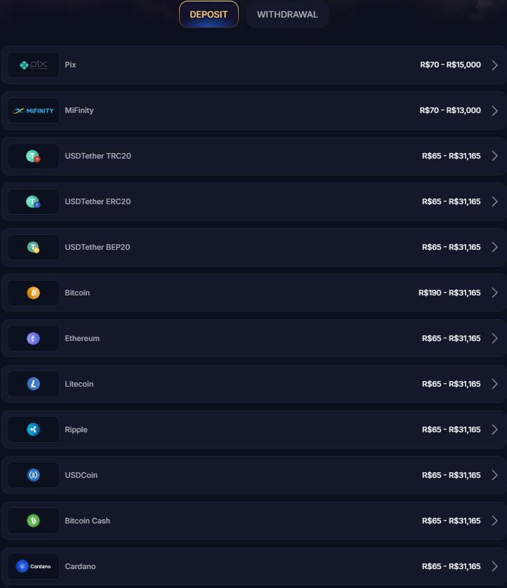 Für jede Zahlungsmethode gibt es unterschiedliche Mindest- und Höchstbeträge für Einzahlungen. Für Mastercard beträgt der Mindestbetrag 10 EUR und der Höchstbetrag 2.000 EUR. Für Utorg PSCD liegt der Mindestbetrag bei 10 EUR und der Höchstbetrag bei 950 EUR. Für Kryptowährungen beträgt der Mindestbetrag 10 EUR und der Höchstbetrag 5.000 EUR. Detaillierte Informationen erhalten Sie im Bereich Zahlungen.