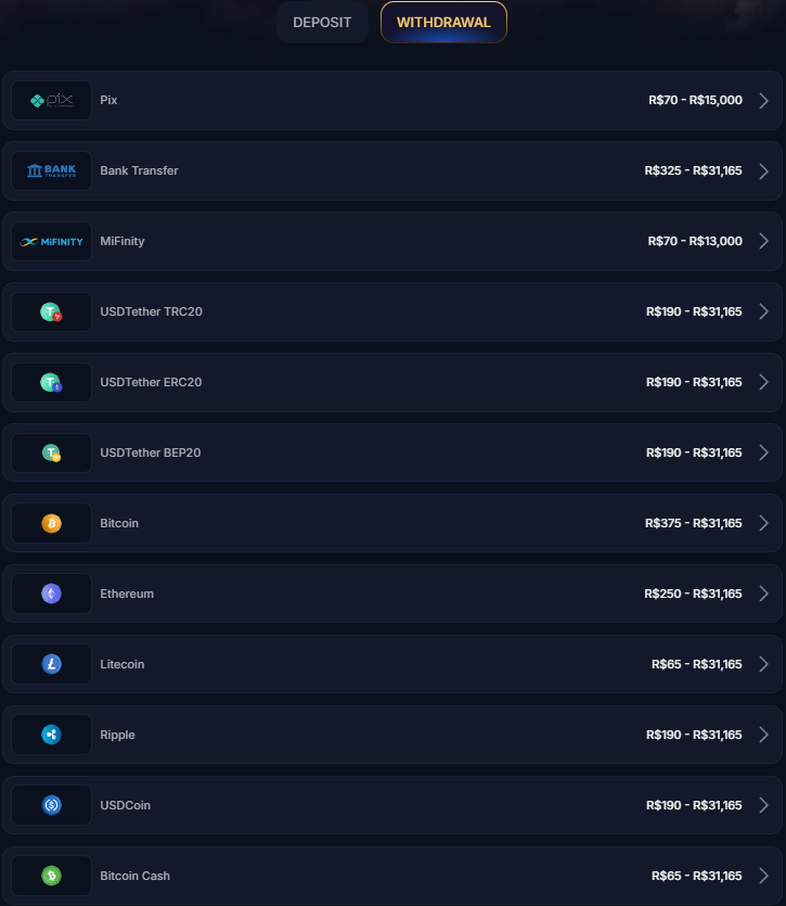 Sie können mit Visa, Mastercard, Banküberweisung, Mifinity und Kryptowährungen abheben. Die Mindest- und Höchstbeträge für Abhebungen variieren je nach der von Ihnen gewählten Methode. Der Auszahlungsantrag wird innerhalb von drei Werktagen von der Finanzabteilung geprüft.