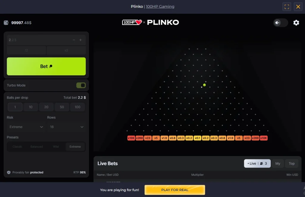 Plinko von 100HP Gaming ist ein einfaches Arcade-Spiel mit 4 Risikostufen, bis zu 16 Reihen und bis zu 10.000x Gewinn. Leicht zu spielen, hoher RTP.